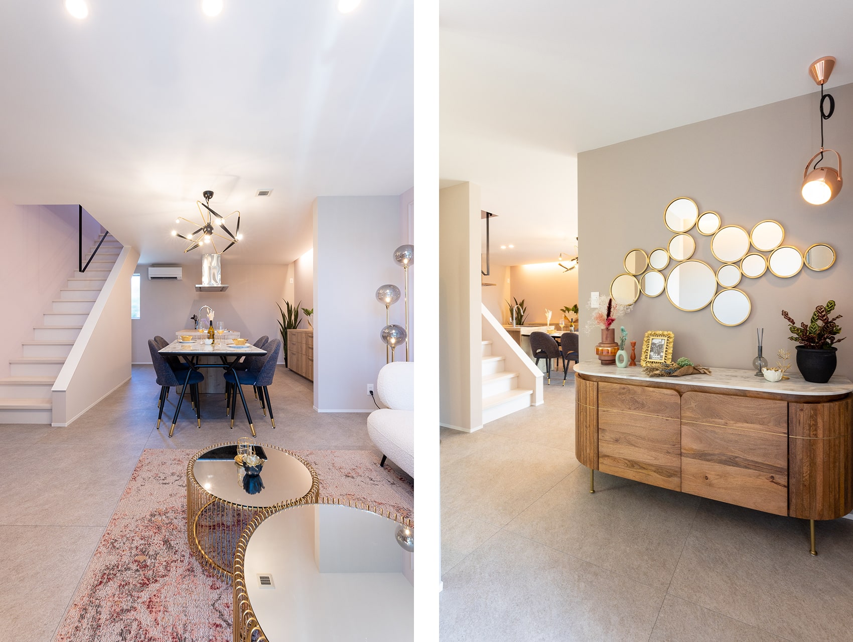 リビングダイニングを一望できる空間。洗練された照明と調和のとれた家具が、暮らしの中心をスタイリッシュに彩ります。