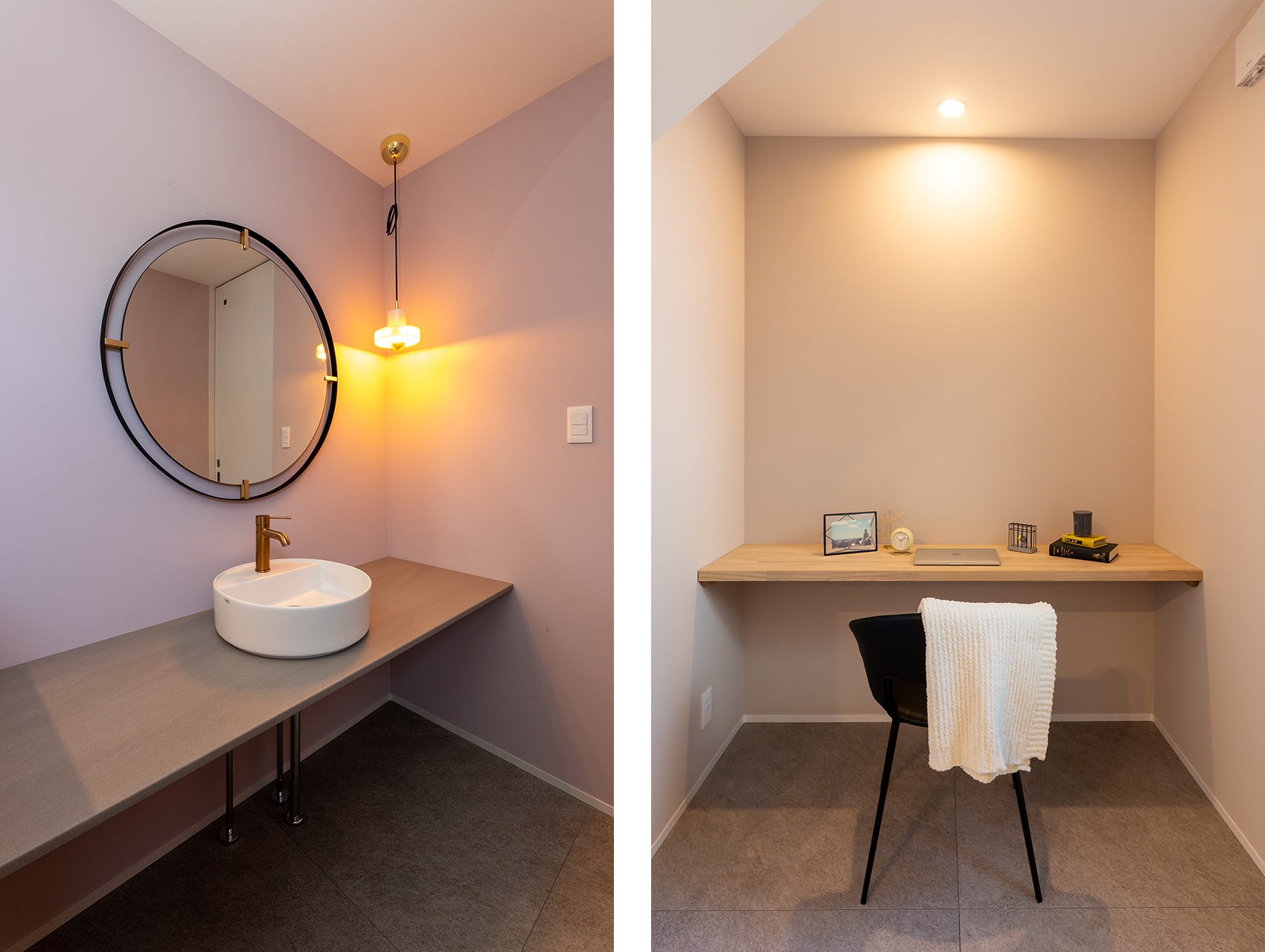 丸い鏡と間接照明が印象的な洗面スペース。柔らかな光が壁を照らし、上品で落ち着いた雰囲気を漂わせています。