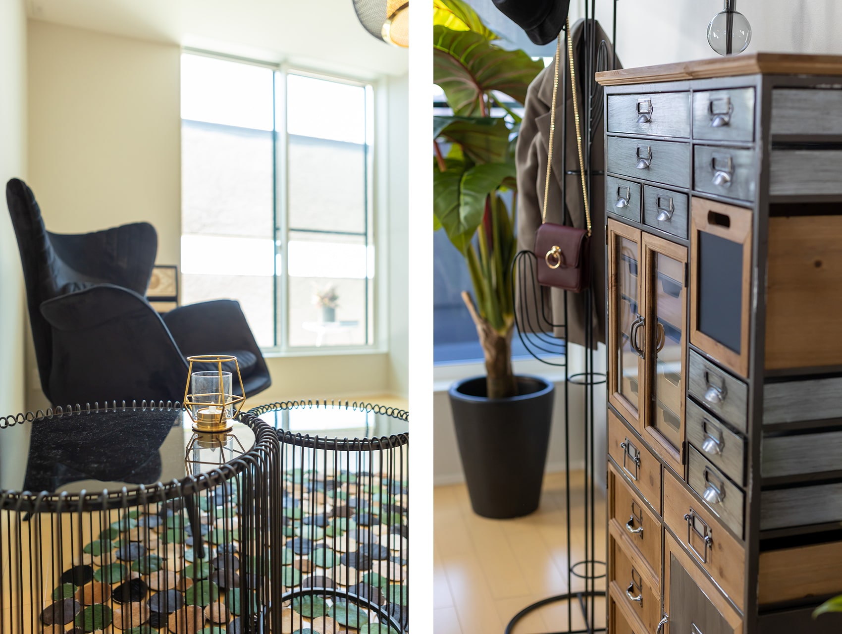 アンティーク調のチェストがアクセントになったコーナー。小物や植物が彩りを添え、住まい全体に温もりと個性を感じさせます。