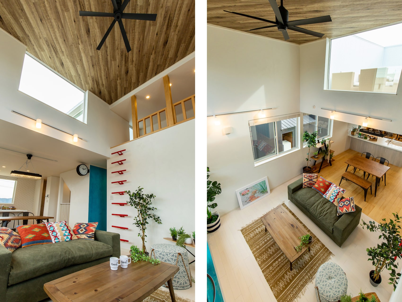 吹き抜けに六枚刃のシーリングファンを設置することで上下の温度差を軽減し、部屋全体を均一な温度に保ちます。