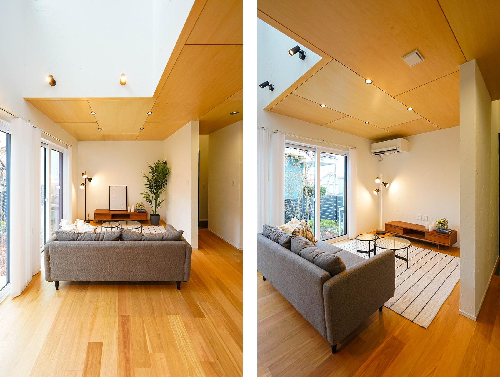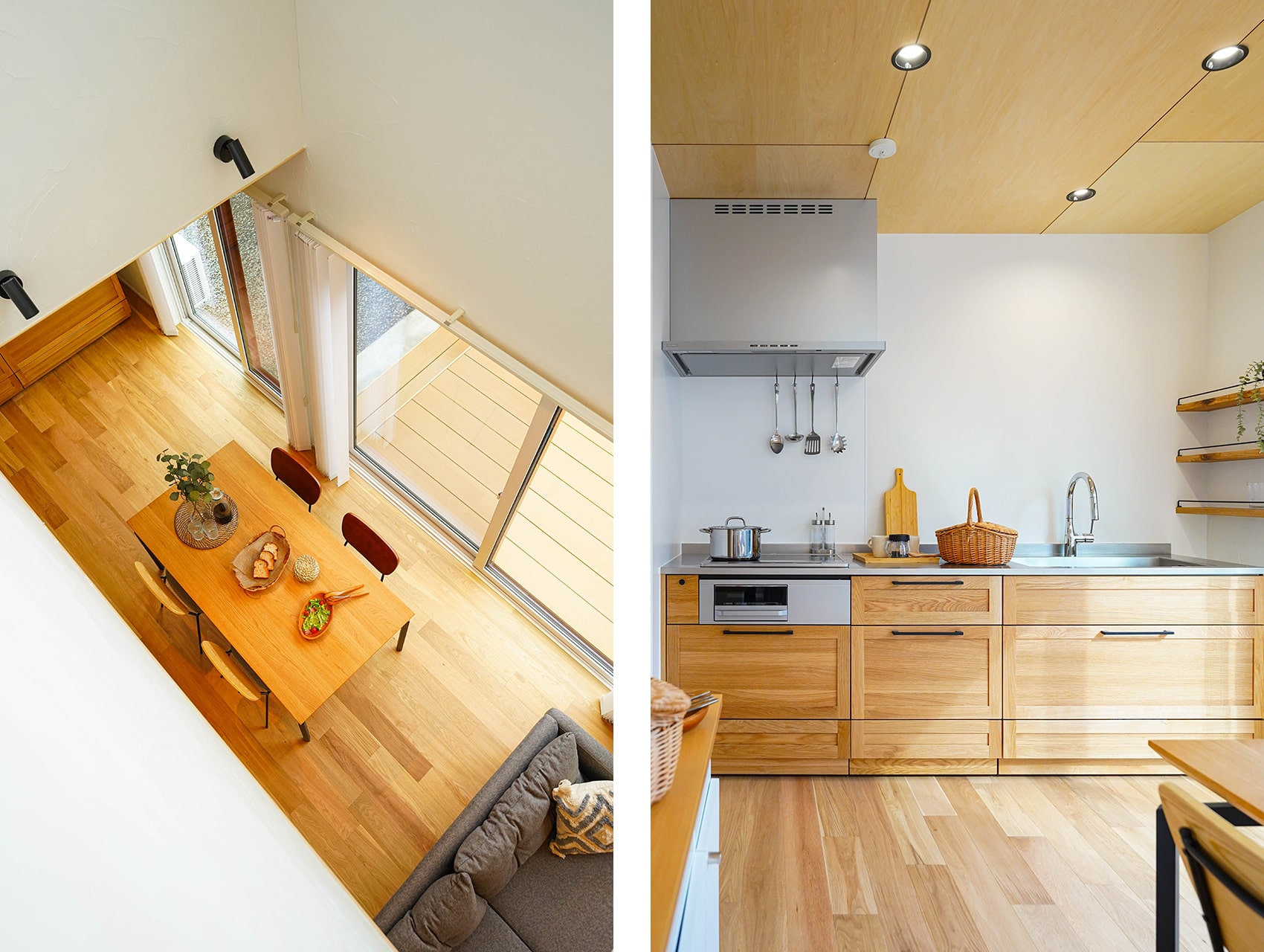 LDKとダイニングの中央に吹き抜けを配置することで、直射日光による眩しさを軽減し、間接的な優しい光がLDKを包み込みます。