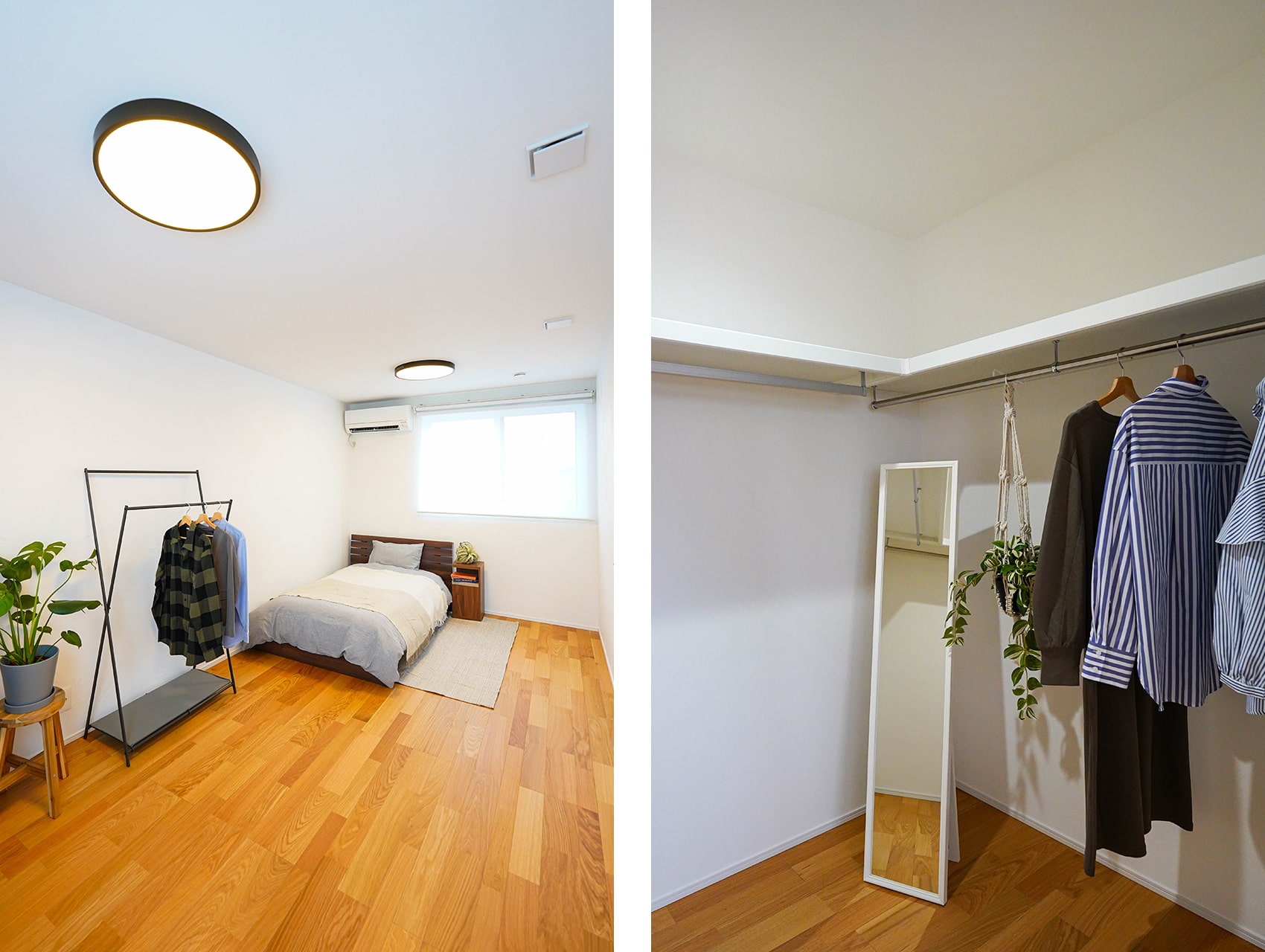 奥行を広く設計された寝室は開放的でくつろぎ空間を演出します。広めのウォークインクローゼットを設けることで物がないスッキリとした寝室に。