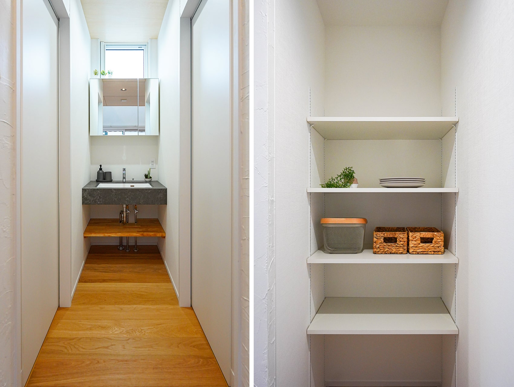 通路奥の幅にシンデレラフィットした洗面台と収納空間、室内も無駄なスペースをなくし最大限利用した工夫がなされています。